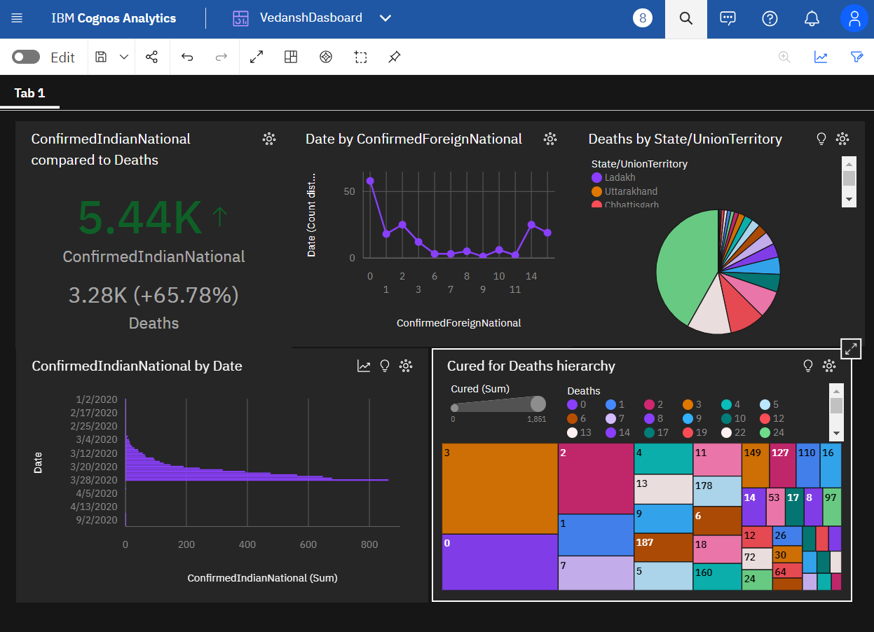 The COVID-19 Analytics Dashboard is a project developed using IBM Cognos, a powerful business intelligence and analytics platform. The goal of this project is to provide a comprehensive and visually appealing dashboard that enables users to analyze and visualize data related to the COVID-19 pandemic. The dashboard integrates various data sources, including official government reports, public health databases, and other reliable sources, to provide up-to-date and accurate information on COVID-19 cases, deaths, recoveries, testing rates, vaccination progress, and other relevant metrics. The data is collected, processed, and transformed into meaningful insights using IBM Cognos' data modeling and analytics capabilities. The dashboard offers a user-friendly interface with interactive visualizations, charts, graphs, and maps that allow users to explore the data from different angles and perspectives. Users can filter the data by geographic location, time periods, demographic factors, and other variables to gain deeper insights into the impact of COVID-19.